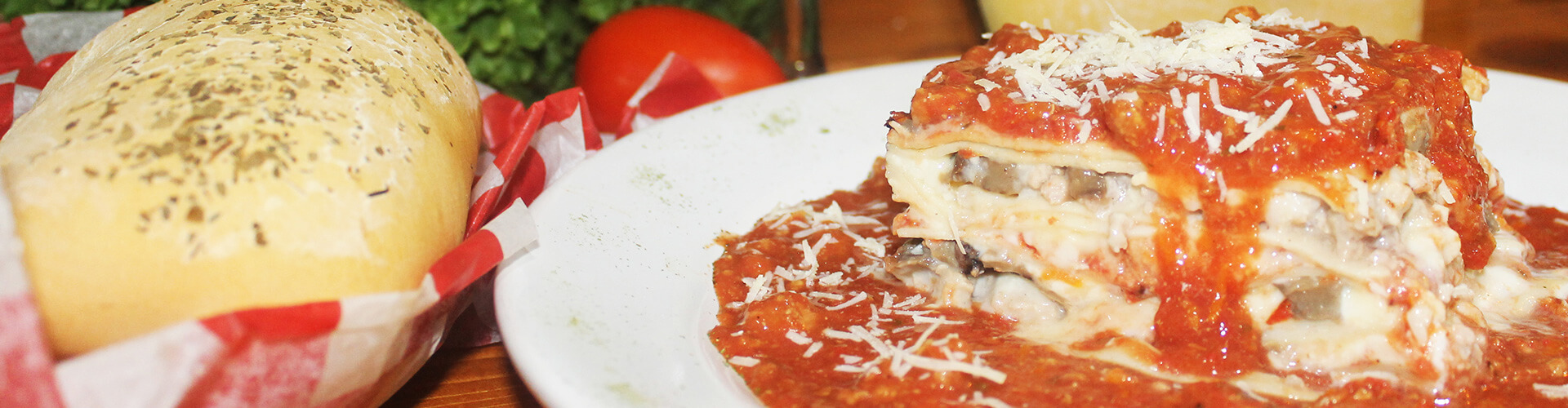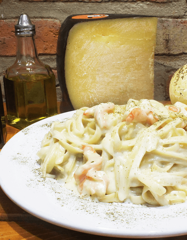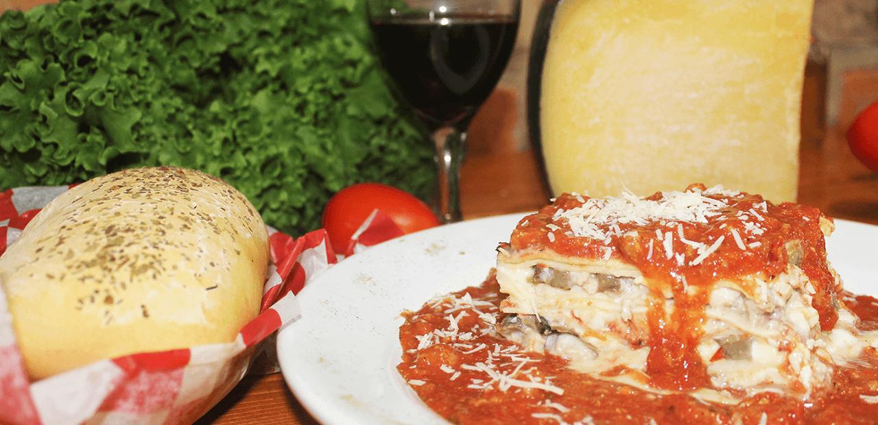 Tiras de pasta, salsa ragú, champiñones y queso parmesano.