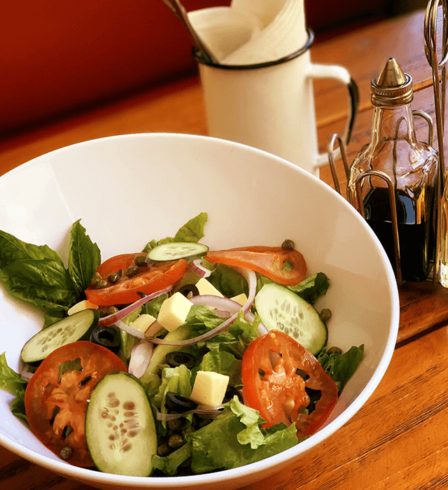 Lechuga italiana, jitomate, queso mozarella, pepino, cebolla, alcaparras y aceitunas negras aderezada con aceite de olivo y vinagre balsámico.