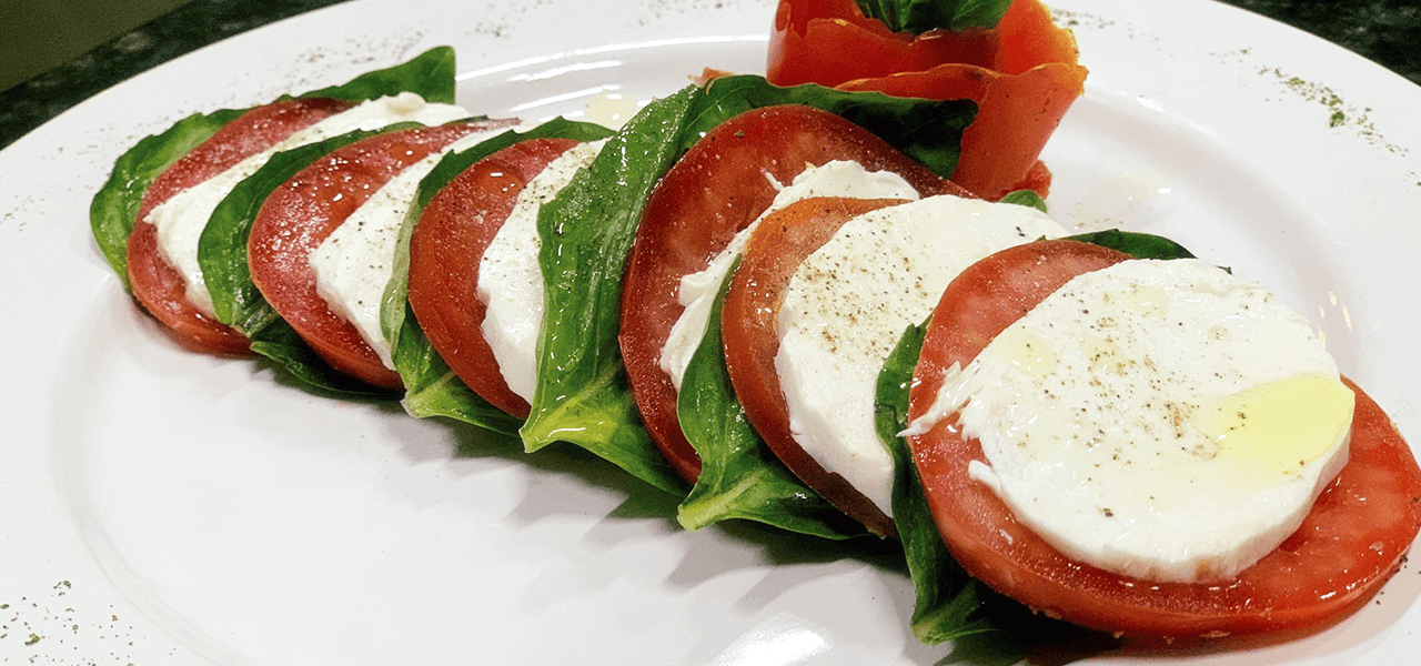Rodajas de queso bocconcini, láminas de jitomate y albahaca aderezado con aceite de oliva, sal y pimienta.