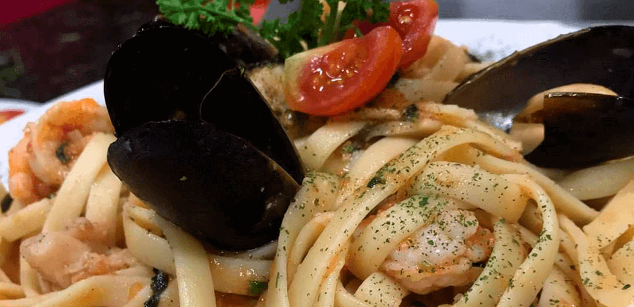 Camarones, pescado y mejillones bañado en salsa pomodoro.